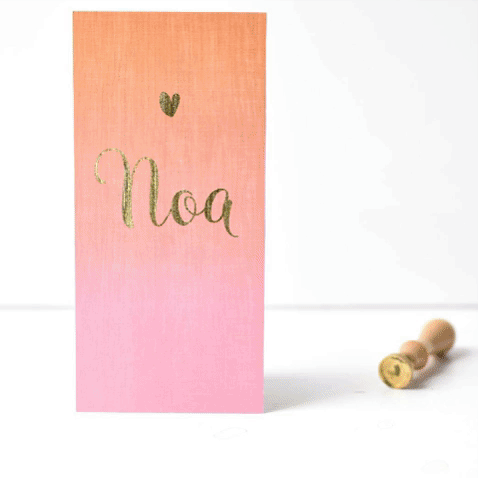 Kelly wilde graag kleur en graag goud in het geboortekaartje. Hoe mooi is het, dat we nu ook digitaal goudfolie kunnen aanbrengen! Groot voordeel hierbij is dat je niet eerst een cliché (of stempel) hoeft te maken en goud dus makkelijker is te verwerken in het design. Zoals de naam in goud- of koperfolie bijvoorbeeld! En je kan er ook een echte proef van laten drukken. Uiteindelijk koos Kelly voor de koperfolie omdat dit net iets warmer was bij de gekozen kleuren van haar kaartje. Door de proefdruk kon Kelly zo heel goed kiezen wat ze het mooiste vond!
