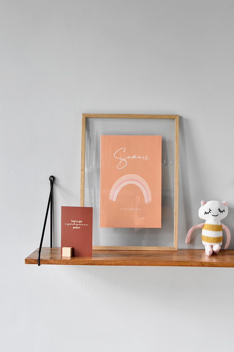 Liever geen poster van je geboortekaartje maar juist een voor in de woonkamer? Maak dan een prachtige strakke poster met een quote of een persoonlijke tekst. Leuk lettertype, mooie achtergrondkleur en voila… je hebt een supermooi cadeau. De poster met de regenboog is bijvoorbeeld 20x30 cm en past heel mooi in een ruime lijst, zoals deze mooie lijst Moebe.